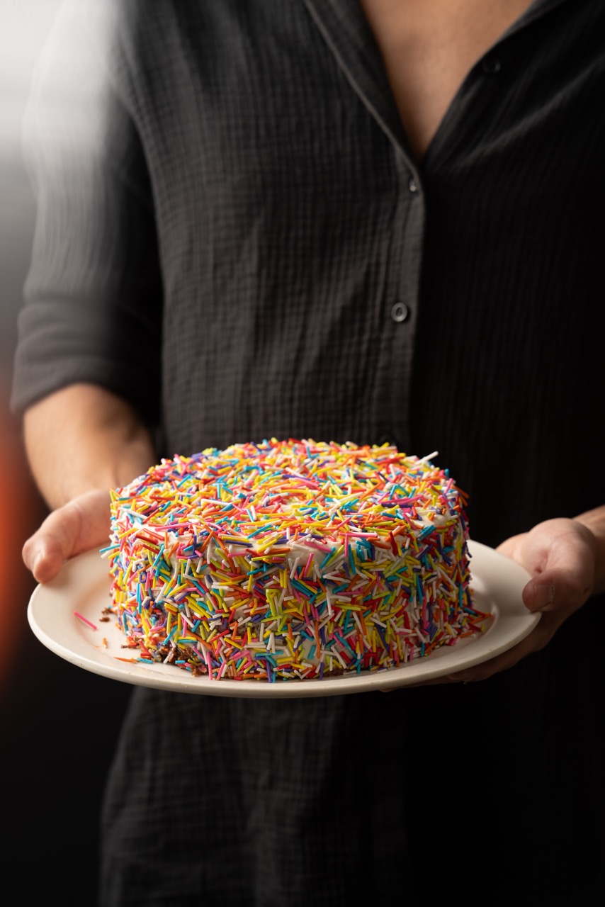 שכבות עוגת שוקולד, גאנש שוקולד חלב מוקצף וסוכריות צבעוניות